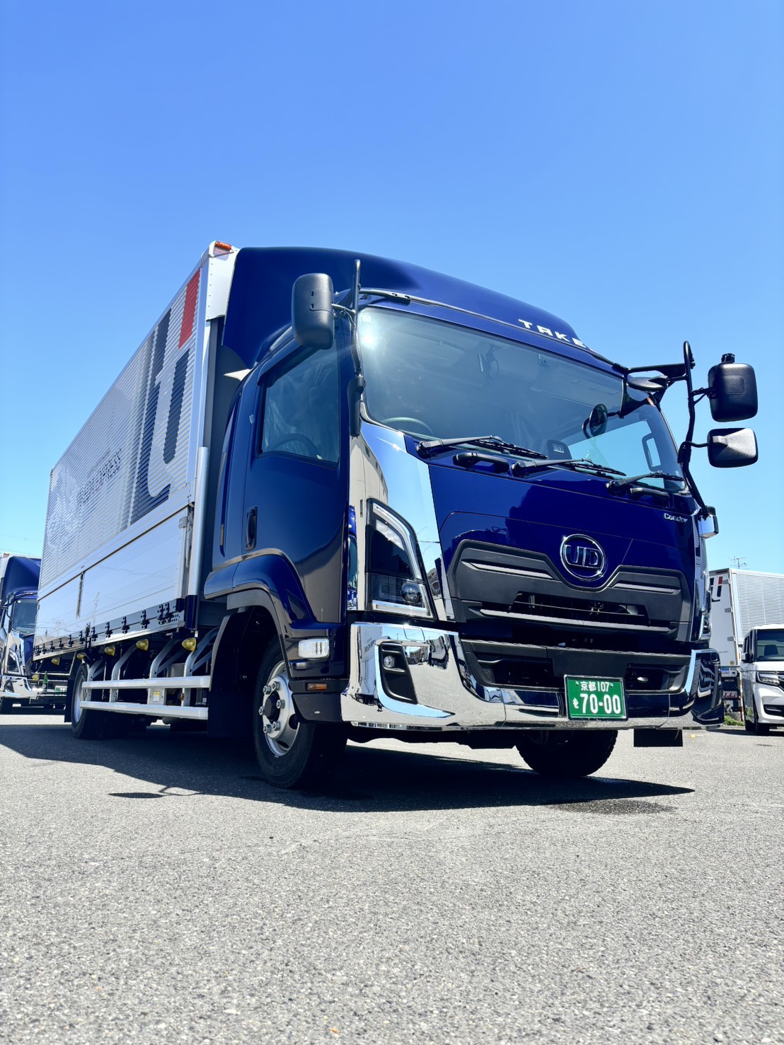 このたび当社に、ピカピカの4tトラックが2台納車されました。1台は竹田、1台はグループ会社のブレイヴワン仕様です。並んだ新車は迫力満点で、見ているだけでワクワクします。これから現場で活躍してくれることを思うと、社員一同とても楽しみにしています。今回の増車により、これまで以上にお客様のニーズに柔軟に対応できる体制が整いました。